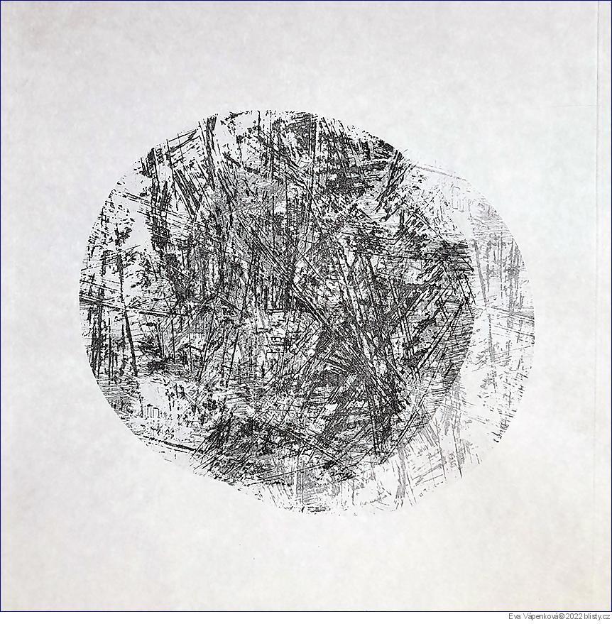 Výrazný kontrast lze ale spatřit na výstavě v galerii Čejka při pohledu na grafická díla Evy Vápenkové, jejichž charakteristickým rysem je naopak uměřenost výtvarného usilování. Úspornou a vždy výstižným formou grafického zpracování, které je výsledkem trpělivého experimentu se strukturou, se snaží autorka vyjádřit to, co se dotýká spíš intuitivních vrstev lidské psychiky. Znovu se prostřednictvím jejího díla ukazuje, že schopnost imaginace je jedním z podstatných povahových rysů člověka a umění.