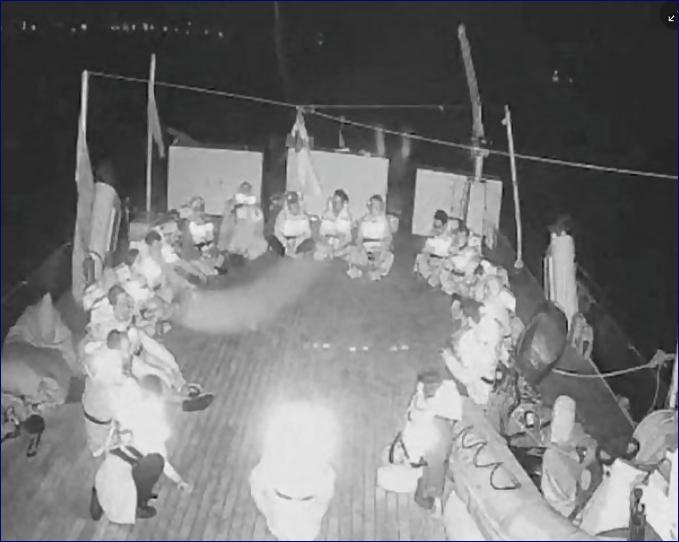 Záběry vysílané stanicí Sky Italia ukázaly aktivisty na palubě, na které dopadaly silné proudy vody. Lidé na palubě uvedli, že také slyšeli hlasité rány v blízkosti několika lodí, které podle nich způsobily omračující granáty shozené z dronů.