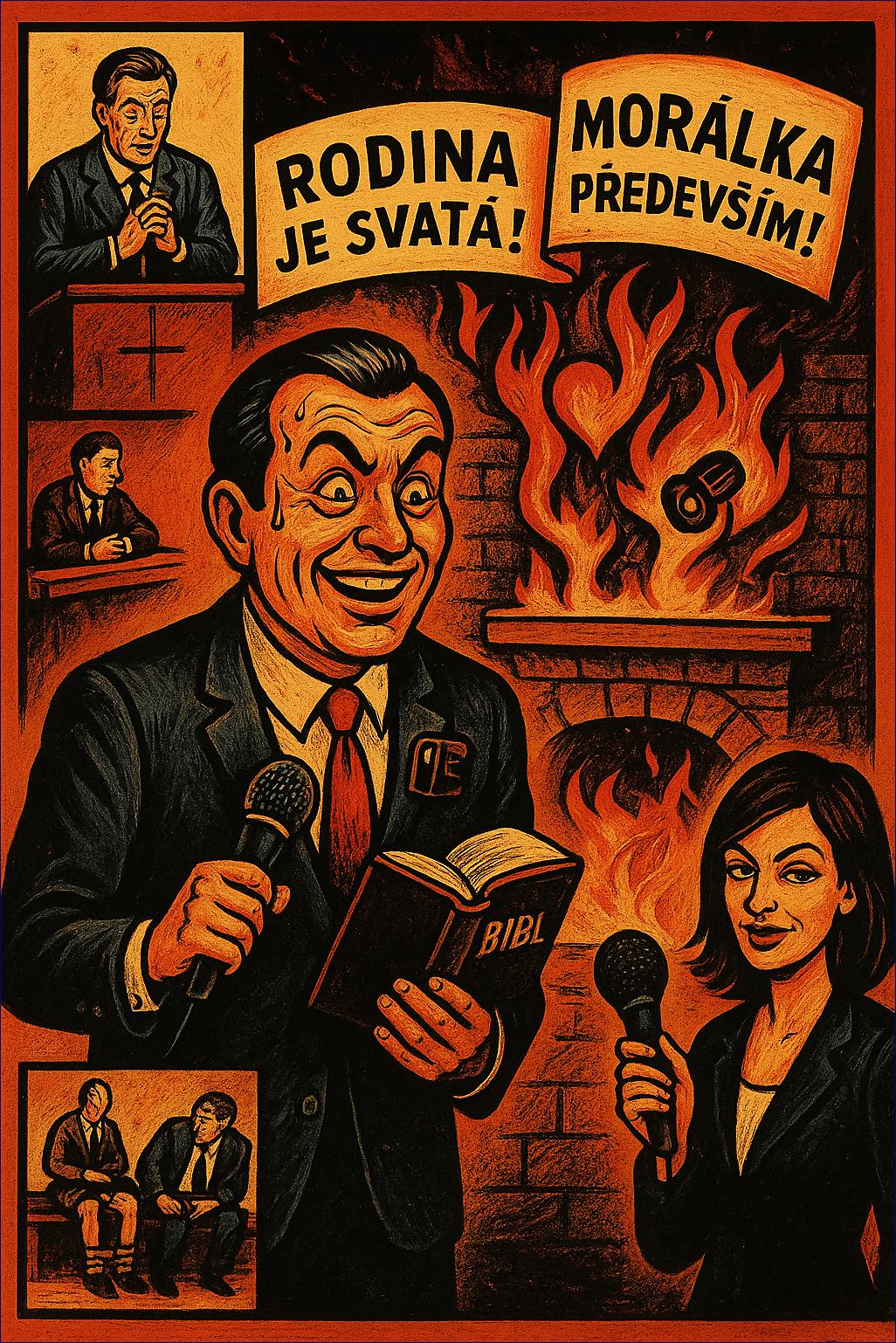 A tak když dnes slyšíme Rajchla mluvit o „amorálních jedincích“, „bahně“ a „útocích na rodinu“, není to hlas nevinného. Je to ozvěna vlastní propagandy, která se mu vrací jako bumerang. Když roky kázal, že morálka se rodí mezi mužem a ženou, nejspíš netušil, že se jednou bude obhajovat kvůli videu, které vypadá přesně jako on – s mužem i ženou, před krbem, a možná i s lehkým úsměvem pokrytce, který právě pochopil, že karma má smysl pro ironii.
