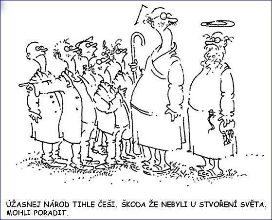 Nedávný článek australské publicistky Caitlin Johnstone nazvaný Změna režimu v USA  mi připomněl starý známý vtip od Vladimíra Renčína. Je na něm vyobrazen Bůh, jeden či dva andělé a zástup viditelně excitovaných lidí, kteří se zjevně hlásí o slovo, překřikují se, každý na něco ukazuje rukama nebo na něco míří prstem. Pod obrázkem je větička: „Úžasný národ, tihle Češi. Škoda, že nebyli u stvoření světa. Mohli poradit“.