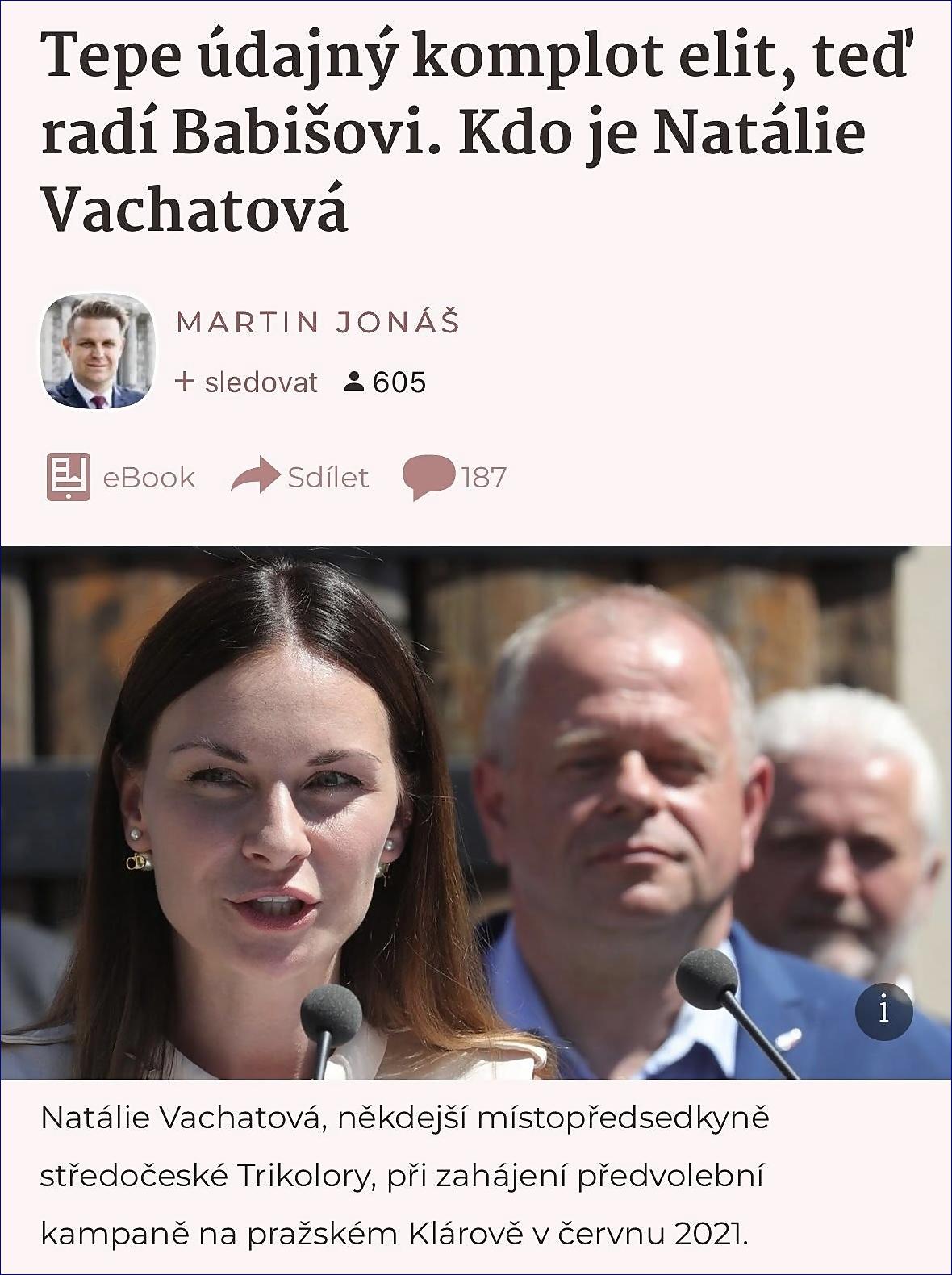 Konec citace. O nových kamarádech pana europoslance - zpravodaje najdete vše podstatné v odkazu na celý text projektu Evidence.ninja. Stejně tak se můžete dozvědět více o naší nové vládní poradkyni pro svobodu-slova-mluvit-o-Rusku-pouze-hezky v článku Seznam Zpráv.