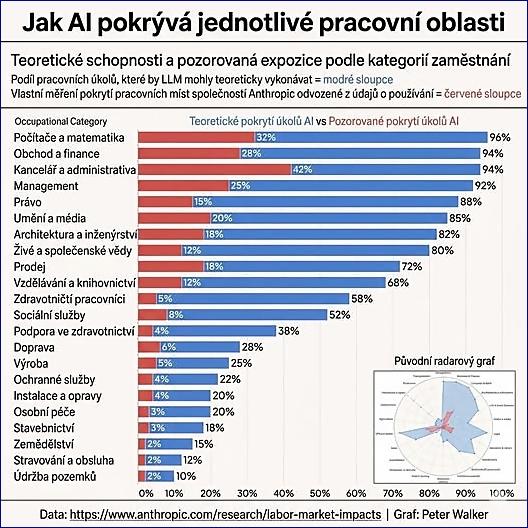 Tohle je nejdůležitější graf pro dnešek. Jak AI dnes zvládá pokrýt jednotlivé pracovní oblasti a z kolika procent se v nich dneska používá. Vývoj SW zvládne například z 96%, používá se jen ze 32%. Kde je vaše pracovní pozice?