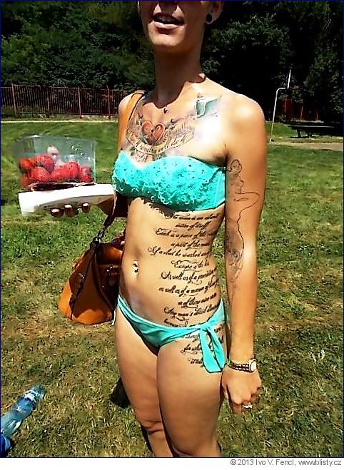 Letošní slova a celé textové nápisy na tělech jako artefaktech byly sice více IN, někdy dost NAIVISTICKÉ až INFANTILNÍ MALŮVKY. Myslete si, co chcete, ale nafotit jsem to všechno nestihl. Nemám kameru do vody a taky si chci trochu užít teplého léta. Carpe diem, povzbuzuje a svádí mě George, než zase zmizí v Kalifornii. Tak jsem si aspoň četl na lidských trupech -- části rukou a nohou, sedě si na svojí oblíbené pozorovatelně u zadních schůdků nad zelenomodrou hlubinou, a ukládal si ty jejich věty a obrázky do svojí záložní paměti, co mé staré hlavě už taky občas dosluhuje: "My chceme vypadat jako TVRĎÁCI, vříská mi při tom do ucha hovorný Milan. Přijdi mezi nás nahoru a uvidíš!" ALE JSOU OPRAVDU TAKOVÍ?, říkám si v duchu pochybovačně?