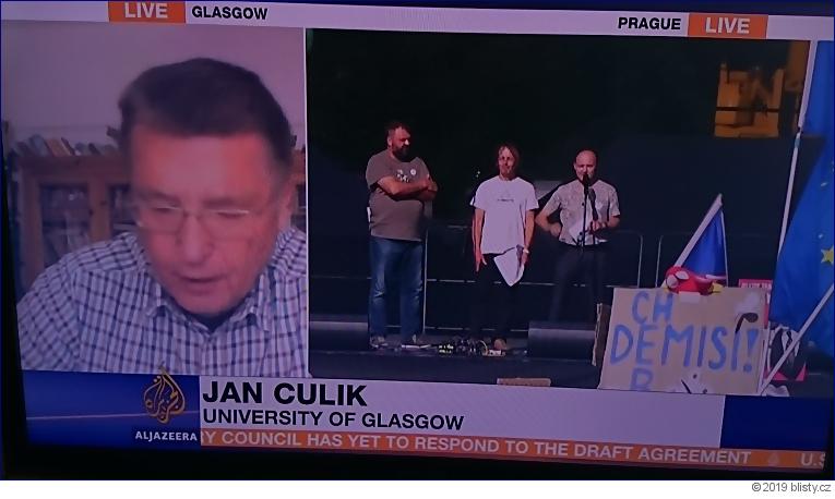 Kamahl Santamaria, moderátor televize Al Jazeera: Právě se v Praze konají protesty, požadující, aby premiér Andrej Babiš odstoupil kvůli obvinění z podvodů. Přicházejí z českého hlavního města skutečně neuvěřitelné záběry. Neuvěřitelné množství lidí, kteří se tuto neděli té demonstrace účastnili. Tyto protesty proti Andreji Babišovi se však konají už od dubna. Téměř půl milionu lidí podepsalo petici požadující, aby odstoupil. Babiš je obviňován, že zneužívá fondů Evropské unie a že miliony eur financují dotace jeho bývalých firem. Tento podnikatel a český populistický politik obvinění popírá. Budeme teď hovořit s Janem Čulíkem, který vyučuje česká studia na univerzitě v Glasgow. Máme ho dnes na Skypu. Jane, jsme rádi, že vás máme ve vysílání. Je to vlastně docela špatné, když na to pomyslíme. Po světě se koná tolik protestů a my jsme zatím toho neslyšeli příliš mnoho o České republice. Ale jak vidíme z těch živých záběrů, veřejnost je v této věci neuvěřitelně silně angažována.