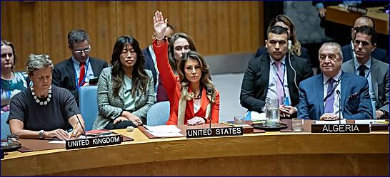 Foto OSN: Laura Jarriel Morgan Ortagus, ministerská rada mise USA při OSN, hlasuje proti návrhu rezoluce během 10 000. zasedání Rady o situaci v Gaze