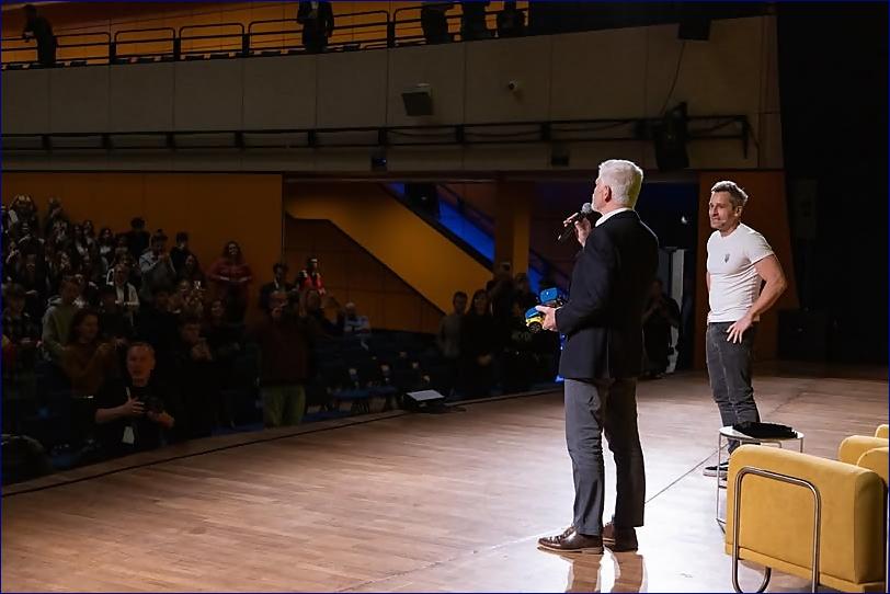 Objevuje se režisér a sál nadšeně tleská.