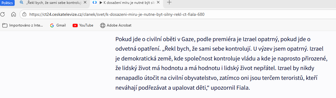 Státní zástupkyně JUDr. Redlová popíračský výrok občana Petra Fialy, který byl vyjádřen pro médium masové komunikace a byl Českou televizí zveřejněn dne 26. 10. 2023 i na jejím webu ve znění „Řekl bych, že sami sebe kontrolují. U výzev jsem opatrný. Izrael je demokratická země, kde společnost kontroluje vládu a kde je naprosto přirozené, že lidský život má hodnotu a má hodnotu i lidský život nepřátel. Izrael by nikdy nenapadlo útočit na civilní obyvatelstvo“, svévolně a v důsledku účelově a dezinformačně použila pro svou nepravdivou argumentaci ve verzi „Řekl bych, že sami sebe kontrolují. U výzev jsem opatrný. Izrael je demokratická země, kde společnost kontroluje vládu a kde je naprosto přirozené, že lidský život má hodnotu…“.