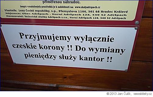 1. Proč je nutné u pokladny do skalního města v Adršpašských skalách (asi 5 kilometrů od polských hranic, 95 procent turistické klientely) štěkat nápisem na polské turisty (jichž je v tomto místě opravdu drtivá většina, bez Poláků by mohli Adršpašské skály klidně zavřít): PŘÍJÍMÁME VÝLUČNĚ JEN ČESKÉ KORUNY, PRO VÝMĚNU PENĚZ SLOUŽÍ SMĚNÁRNA!! Co je to za debilní nacionalistickou aroganci?